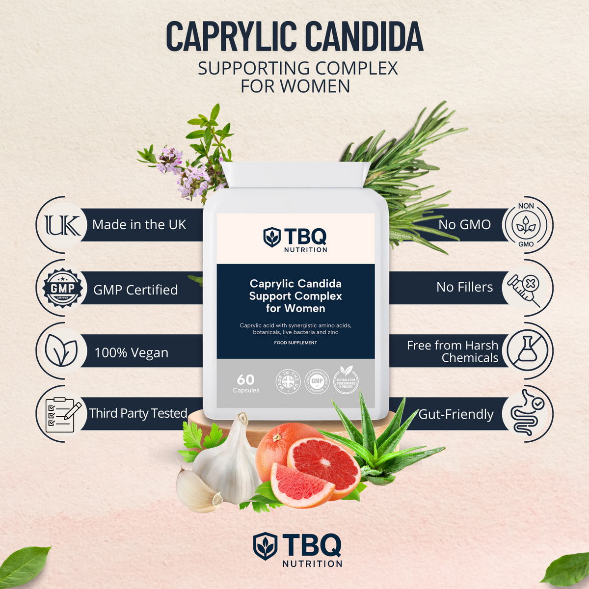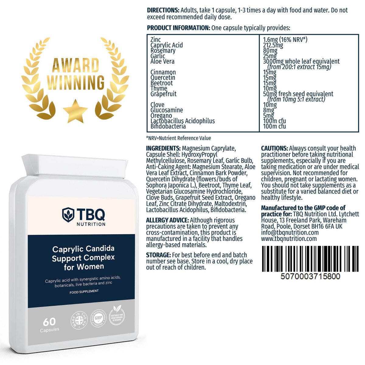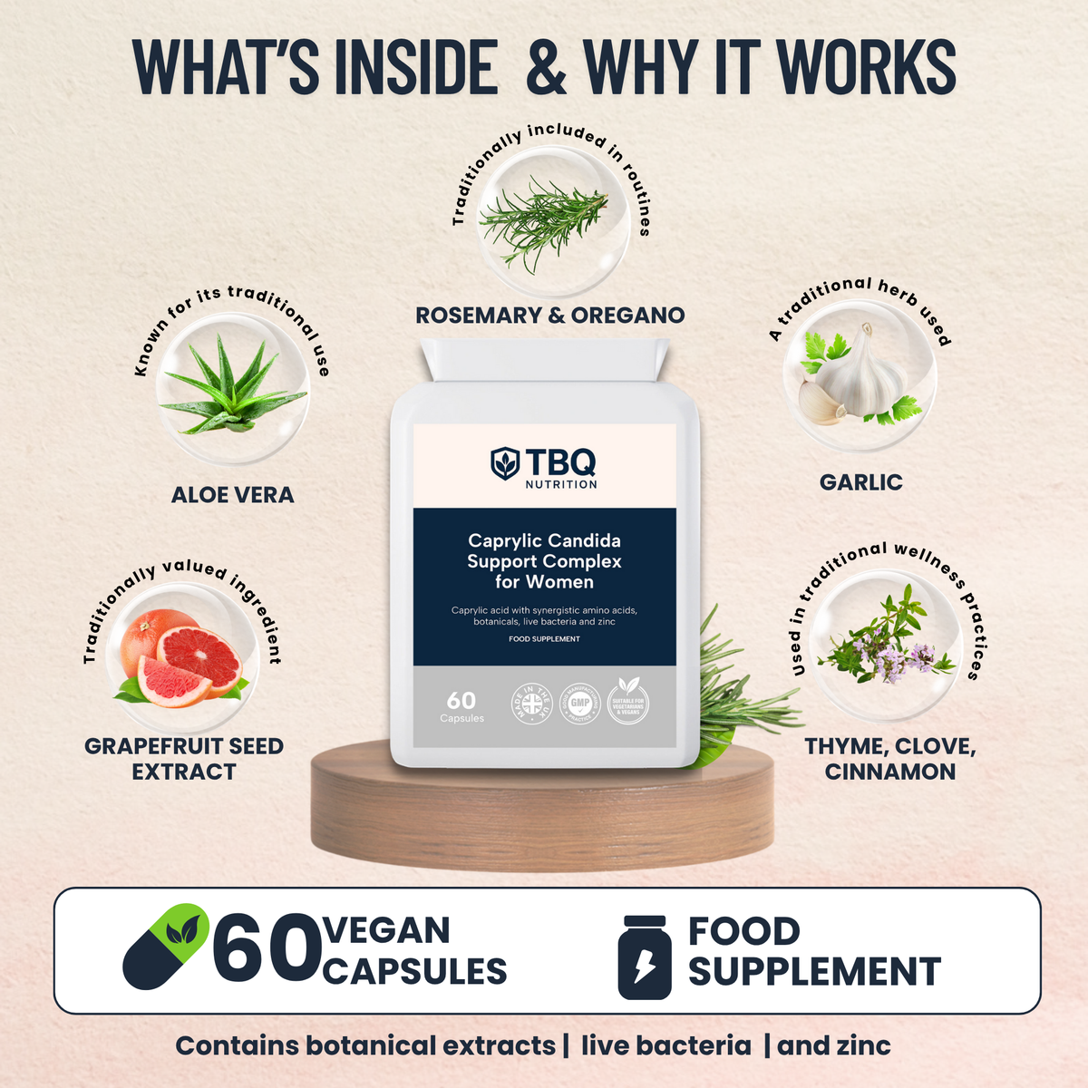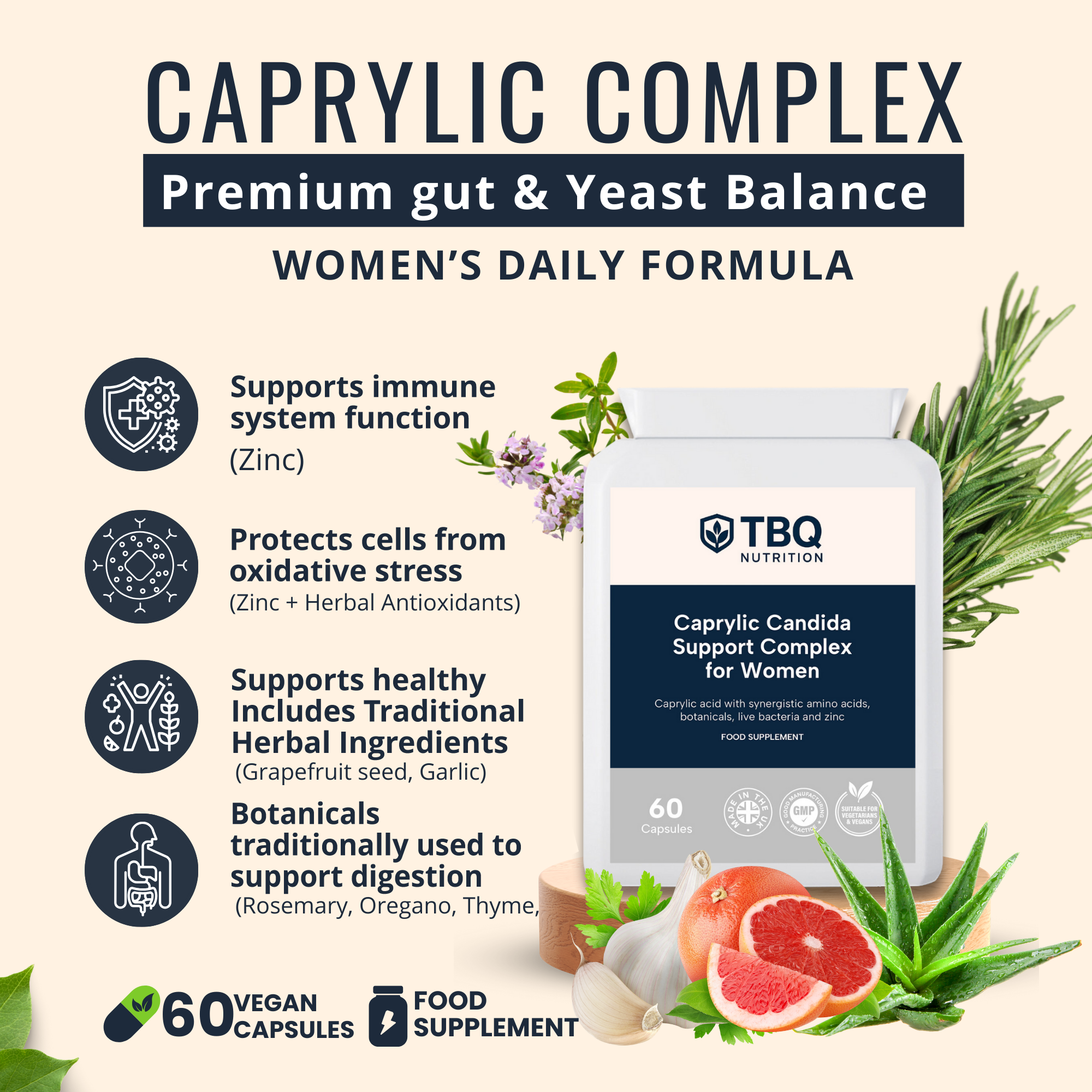 Caprylic Candida Support Complex for Women combines caprylic acid with synergistic amino acids, botanicals, live bacteria, and zinc. Each capsule delivers targeted nutrients including rosemary, garlic, aloe vera, cinnamon, quercetin, beetroot, thyme, grapefruit, clove, glucosamine, oregano, and two strains of friendly bacteria. Zinc contributes to the normal function of the immune system. This comprehensive formula is designed for daily support of women’s wellbeing.