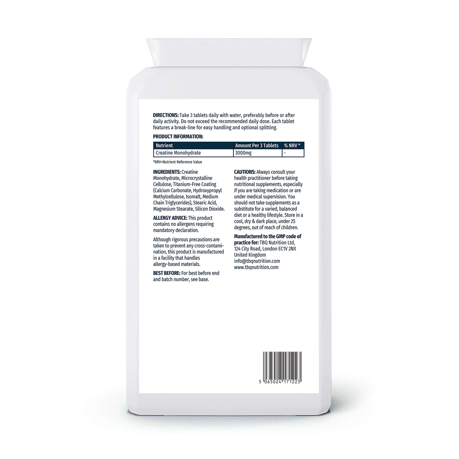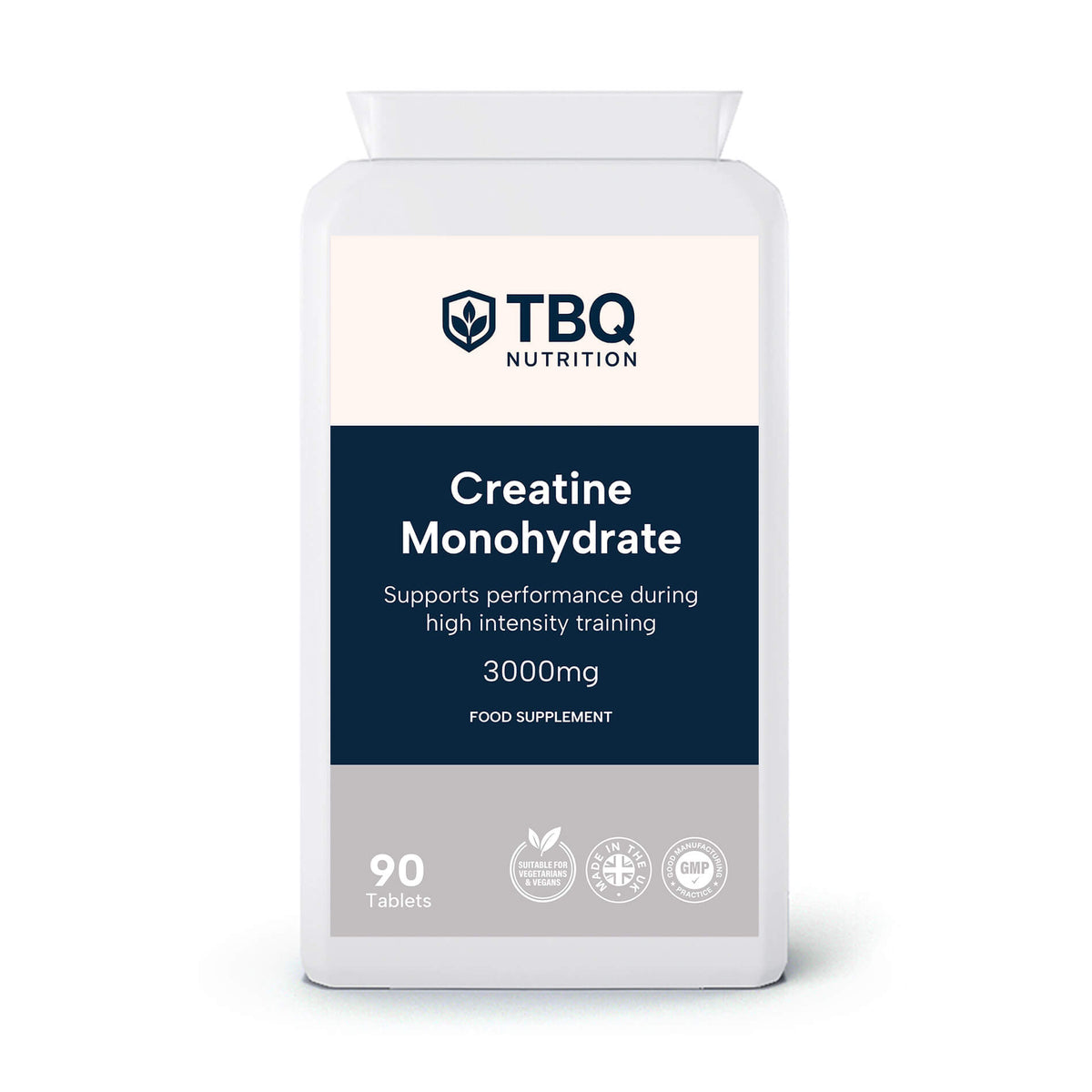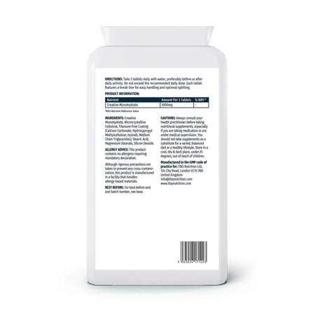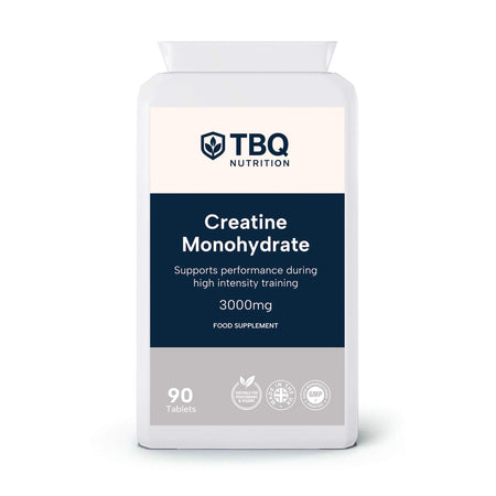 TBQ Nutrition Creatine Monohydrate 1000mg Tablets provide 3000mg of pure creatine monohydrate per daily serving (3 tablets). Creatine increases physical performance in successive bursts of short-term, high-intensity exercise. This convenient tablet format offers an easy alternative to powders, ideal for training, sport, and active lifestyles. Suitable for vegetarians and vegans.