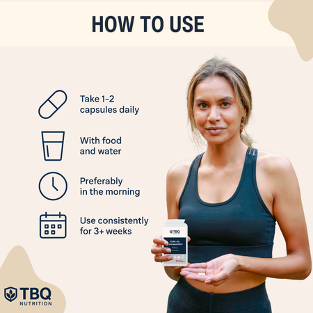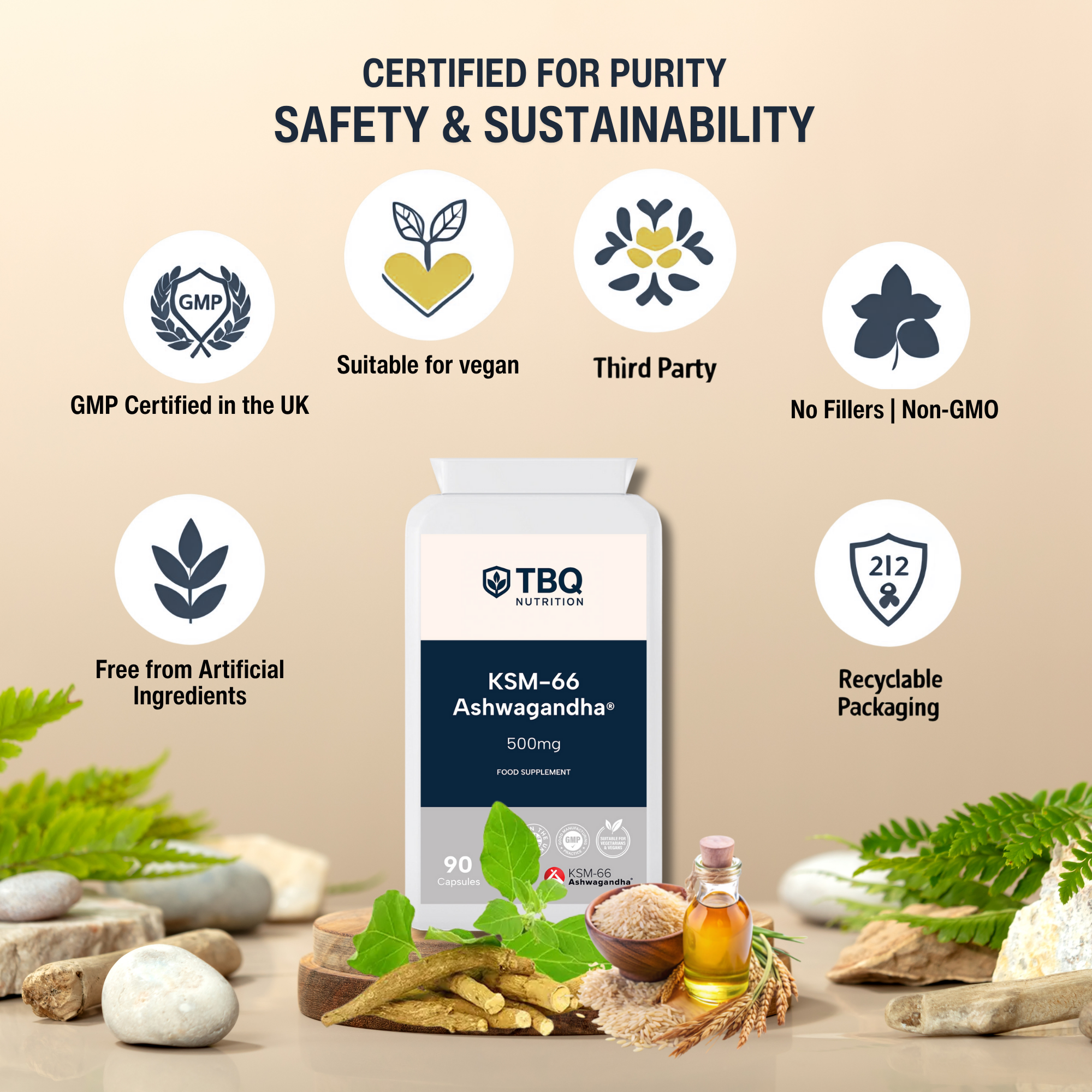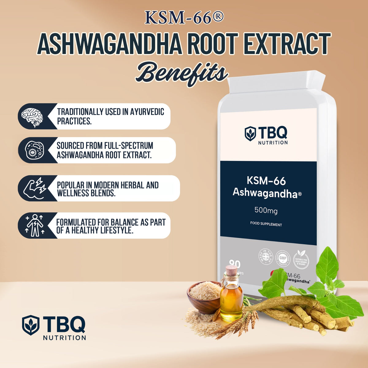 TBQ Nutrition KSM-66 Ashwagandha® provides a potent 500mg of high-quality root extract per capsule, delivering the equivalent of 6,250mg whole ashwagandha root. This advanced adaptogen is clinically researched to help support stress resilience, mood, and overall vitality. Suitable for vegetarians and vegans.