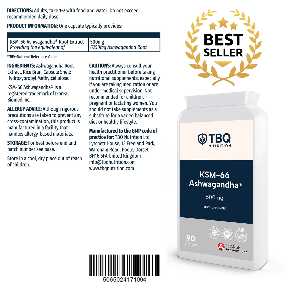 Each capsule provides 500mg KSM-66® Ashwagandha root extract (equivalent to 6,250mg root). 90 capsules per bottle. Suitable for vegetarians and vegans.