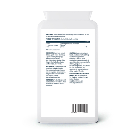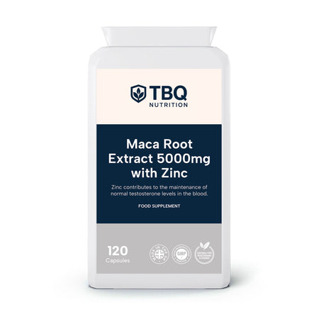 TBQ Nutrition Maca Root Extract 5000mg with Zinc combines a potent 10:1 extract of Maca Root (Lepidium meyenii) with the essential mineral Zinc. Each capsule provides the equivalent of 5000mg whole root Maca, standardised for consistency and quality. Zinc contributes to the maintenance of normal testosterone levels in the blood, as well as normal fertility, reproduction, and immune system function. This carefully balanced blend is designed to support overall wellbeing, vitality, and active lifestyle goals. Suitable for vegetarians and vegans.