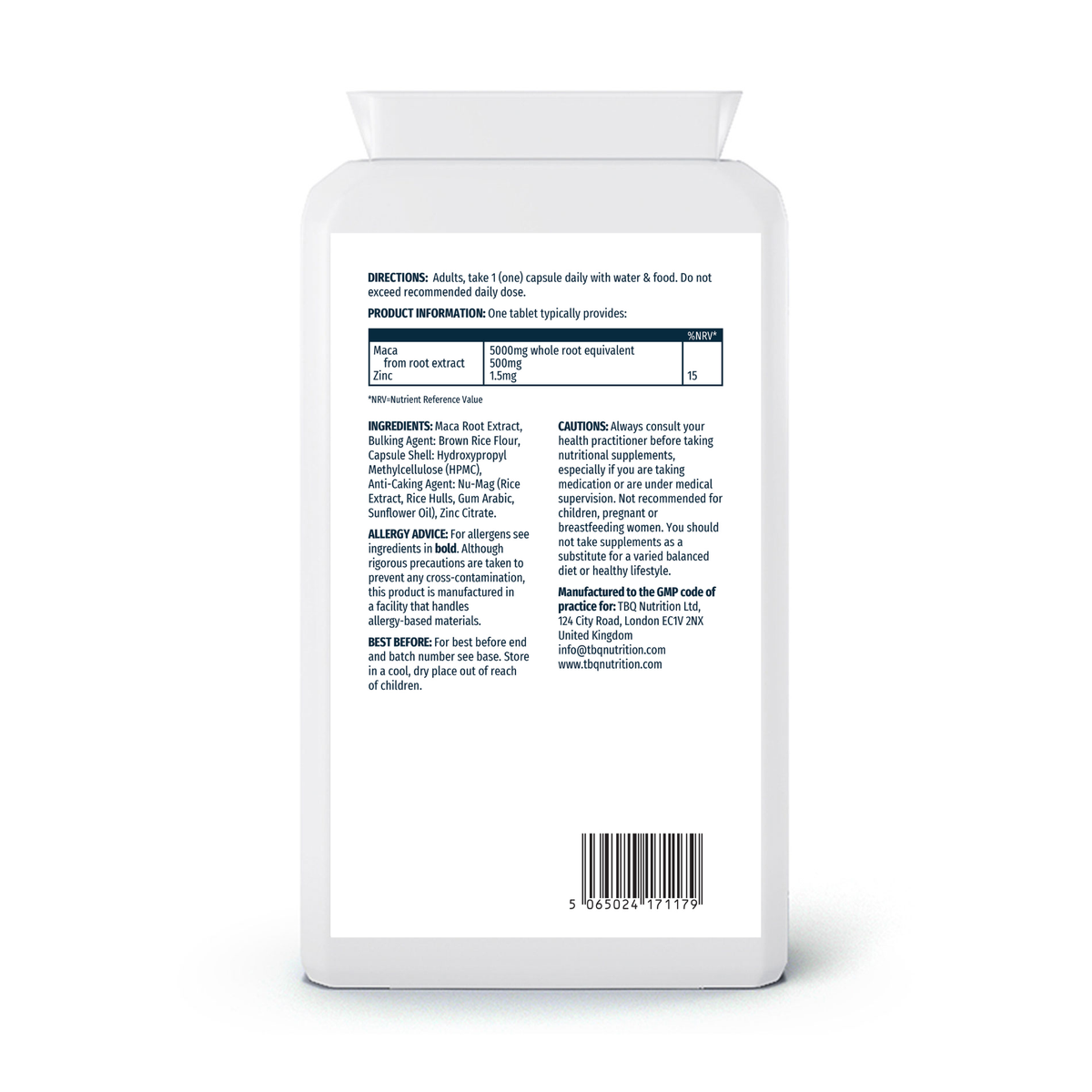 Each capsule provides 500mg Maca Root Extract (10:1) equivalent to 5000mg whole root and 1.5mg Zinc (15% NRV). 120 capsules per bottle. Food supplement.
