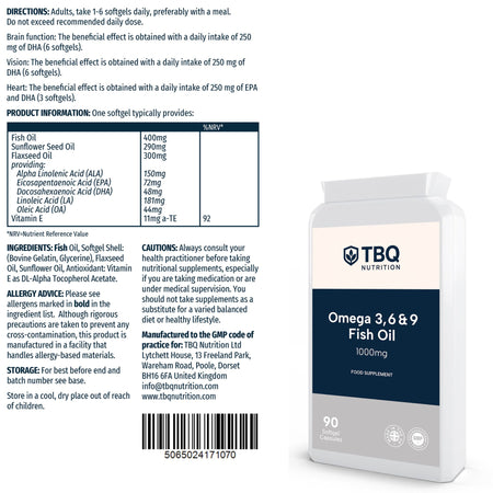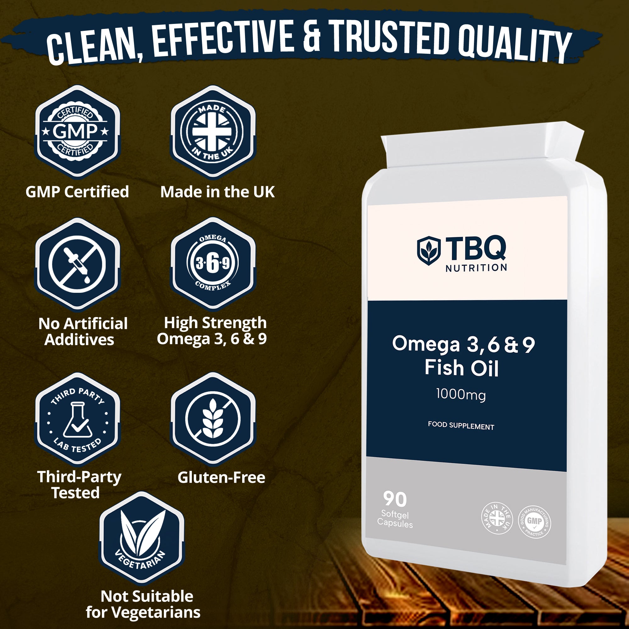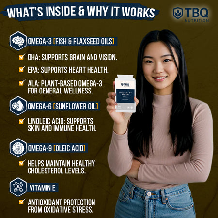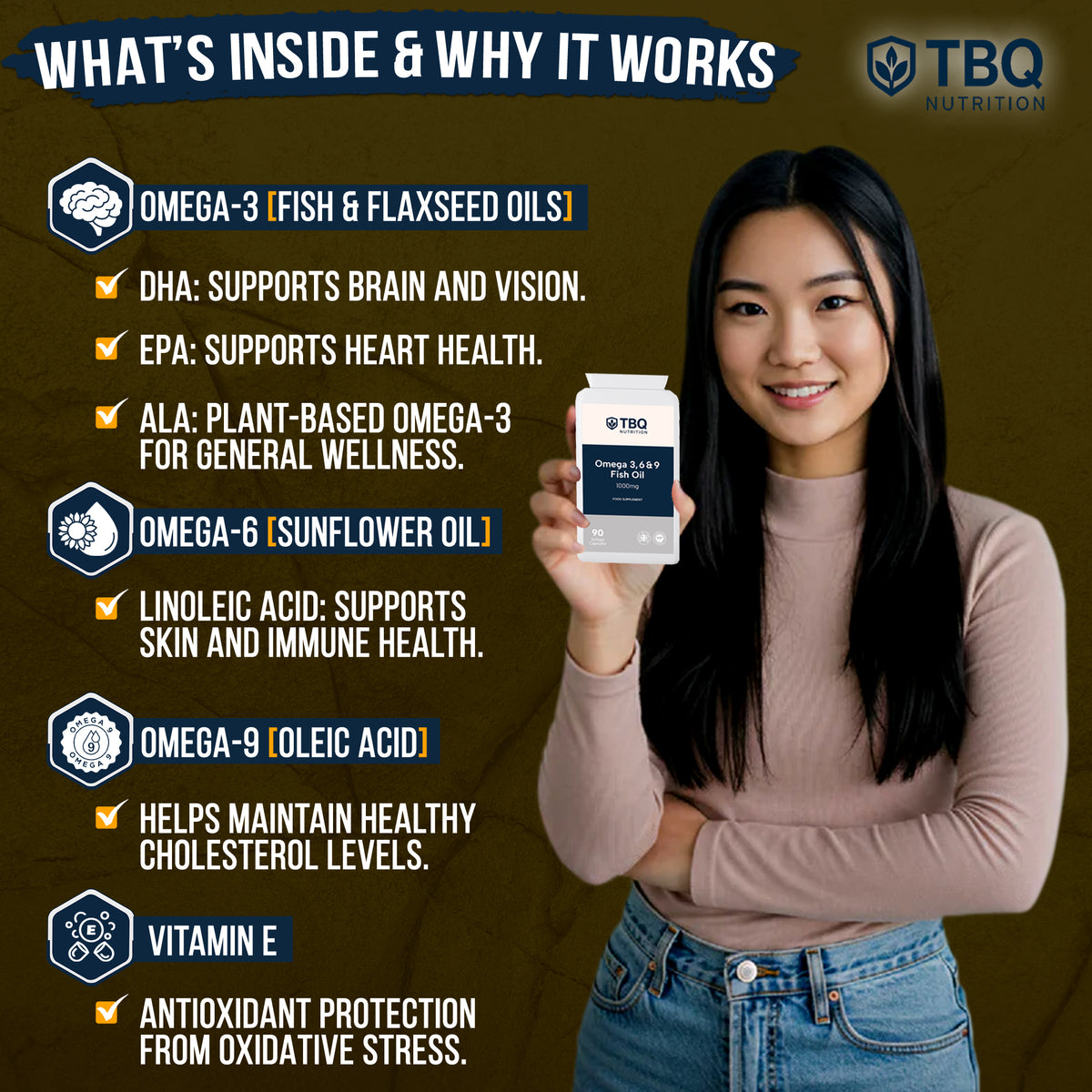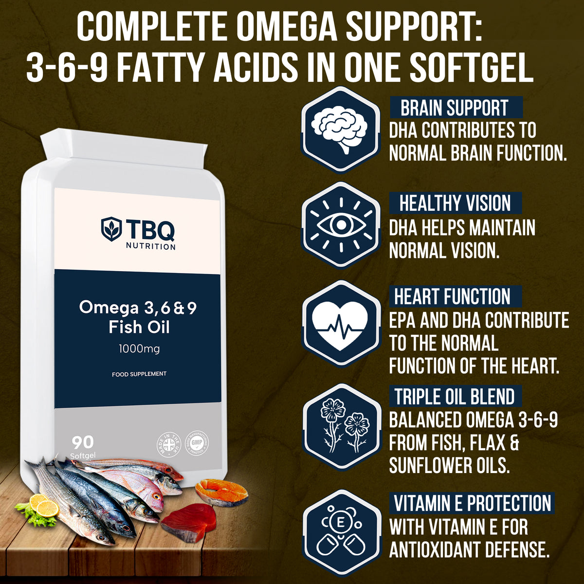 Provides omega-3, 6, and 9 fatty acids to support heart, brain, and vision health. Includes DHA and EPA for normal cardiovascular function and cognitive support. Natural vitamin E helps protect cells from oxidative stress. Suitable for daily use.