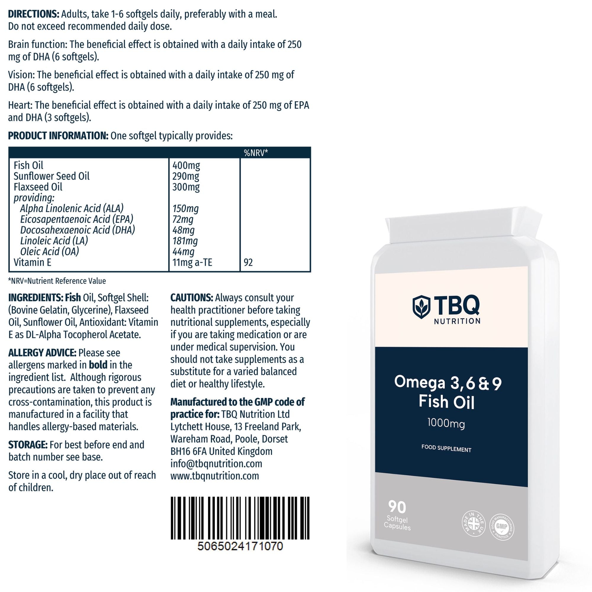 Each softgel provides 400mg fish oil, 290mg sunflower seed oil, 300mg flaxseed oil, 150mg alpha linolenic acid (ALA), 72mg EPA, 48mg DHA, 181mg linoleic acid, 44mg oleic acid, and 11mg vitamin E. 90 softgel capsules per bottle. Food supplement.