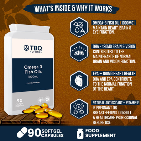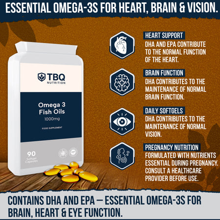 This high-strength Omega 3 Fish Oil provides 1000mg of pure fish oil per softgel, delivering essential omega-3 fatty acids including EPA and DHA. DHA contributes to the maintenance of normal brain function and vision. EPA and DHA together support the normal function of the heart, making this supplement ideal for daily wellbeing and cardiovascular support.