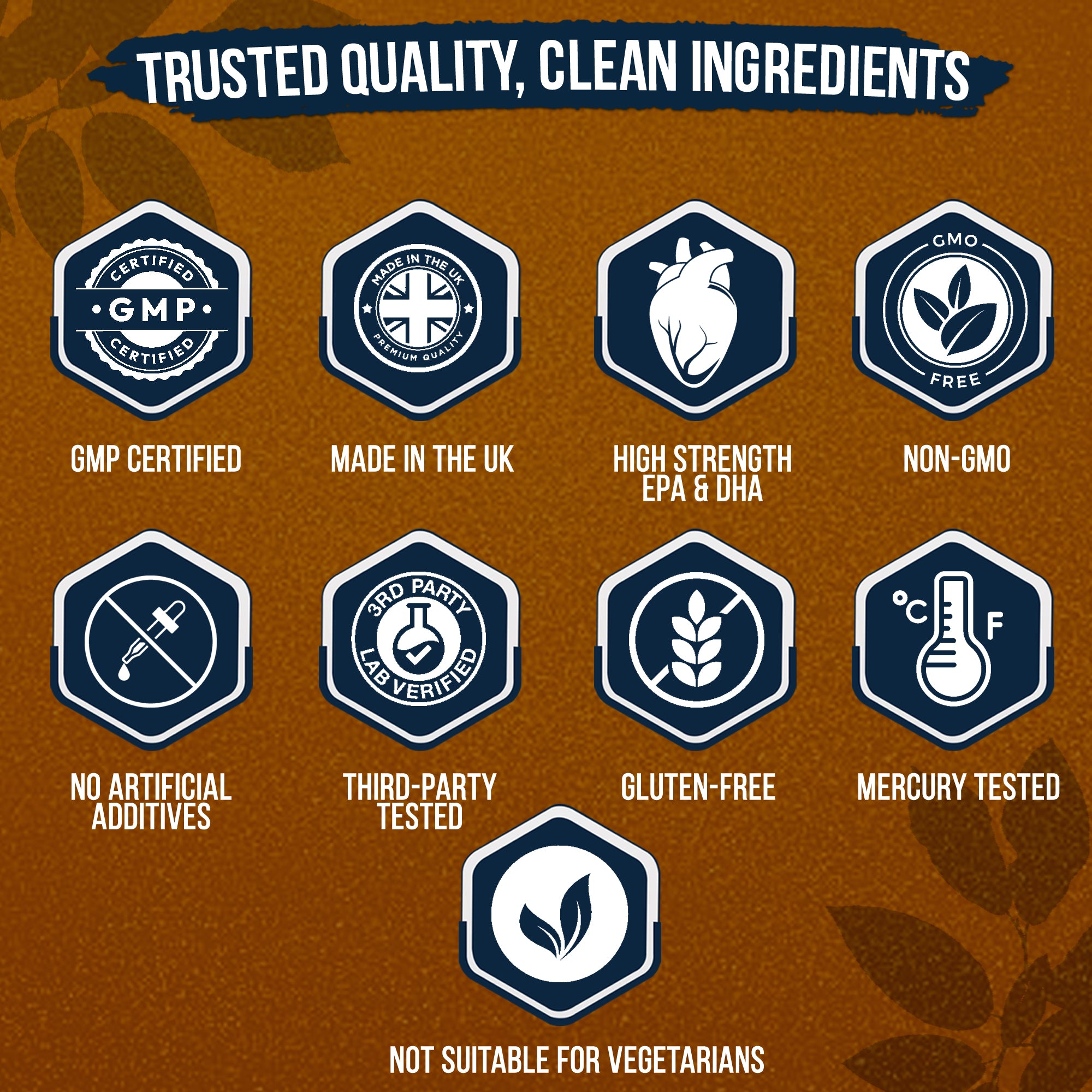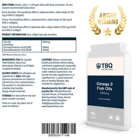 Each softgel provides 1000mg fish oil, with 180mg EPA and 120mg DHA. 90 softgels per bottle. Not suitable for vegetarians.