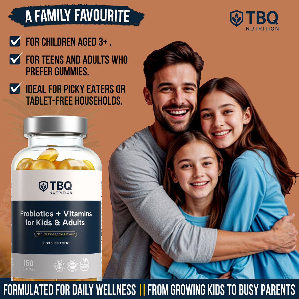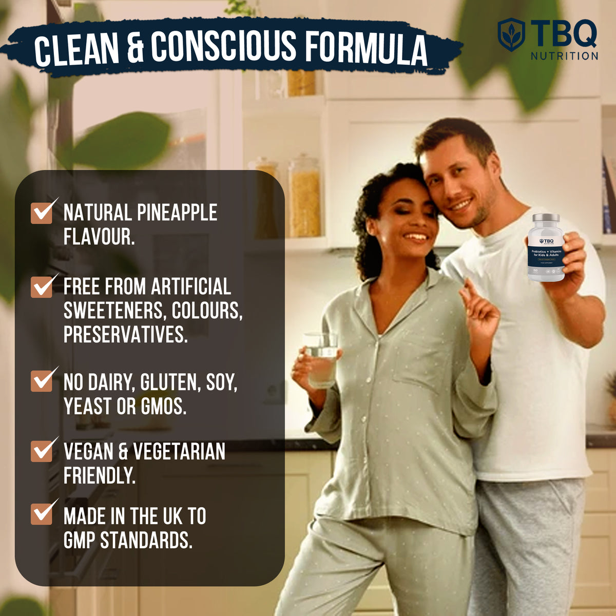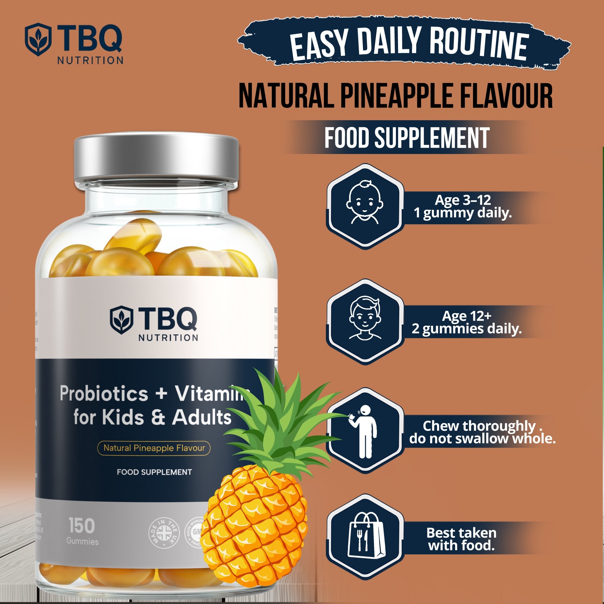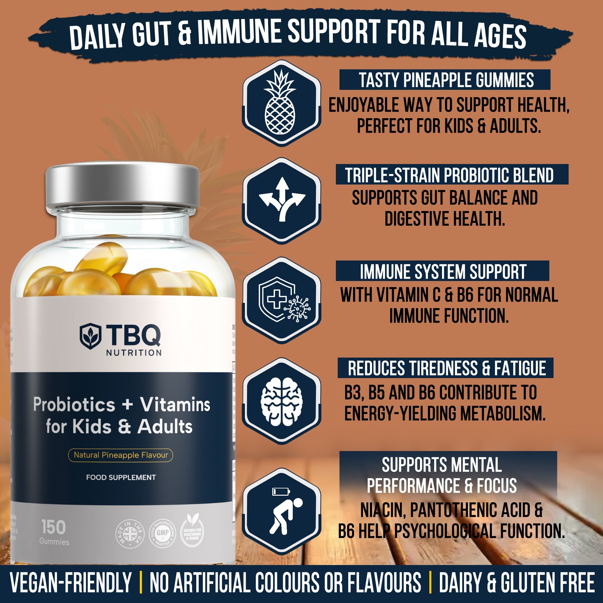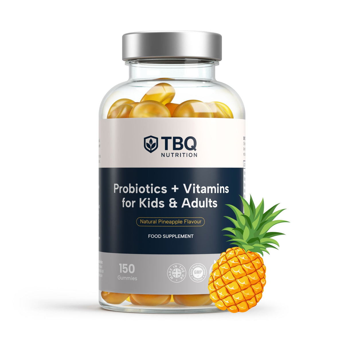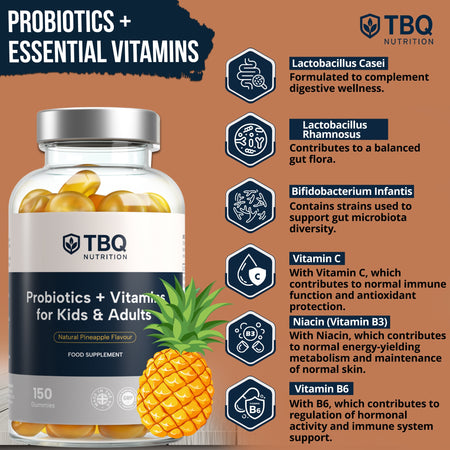 Probiotics + Vitamins Gummies provide a tasty and convenient way to support gut and immune health for all ages. Each natural pineapple flavour gummy combines a blend of three live friendly bacteria strains—bifidobacterium, lactobacillus casei, and lactobacillus rhamnosus—with vitamins C, B3, B5, and B6. Formulated to support digestive balance, energy metabolism, psychological function, and immune system health, these gummies are suitable for both children and adults and are 100% vegetarian and vegan-friendly.