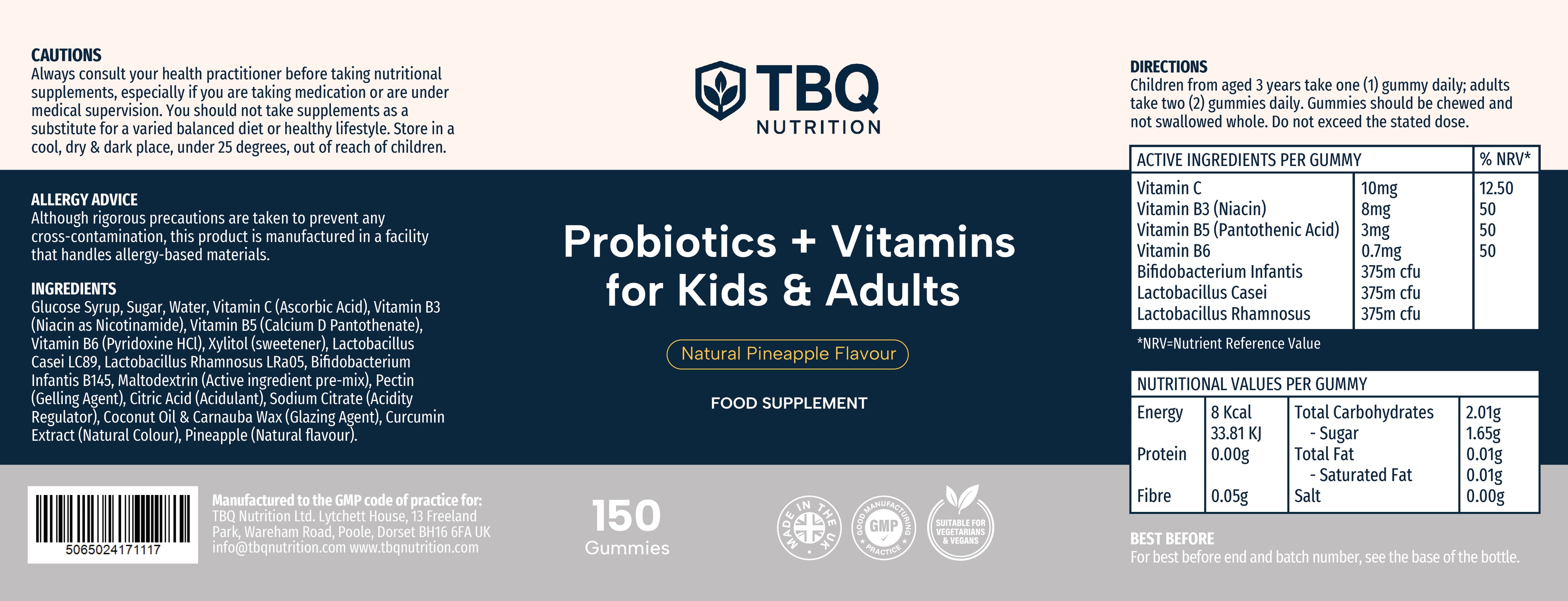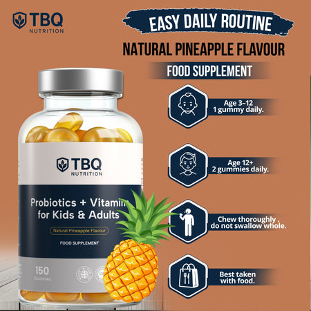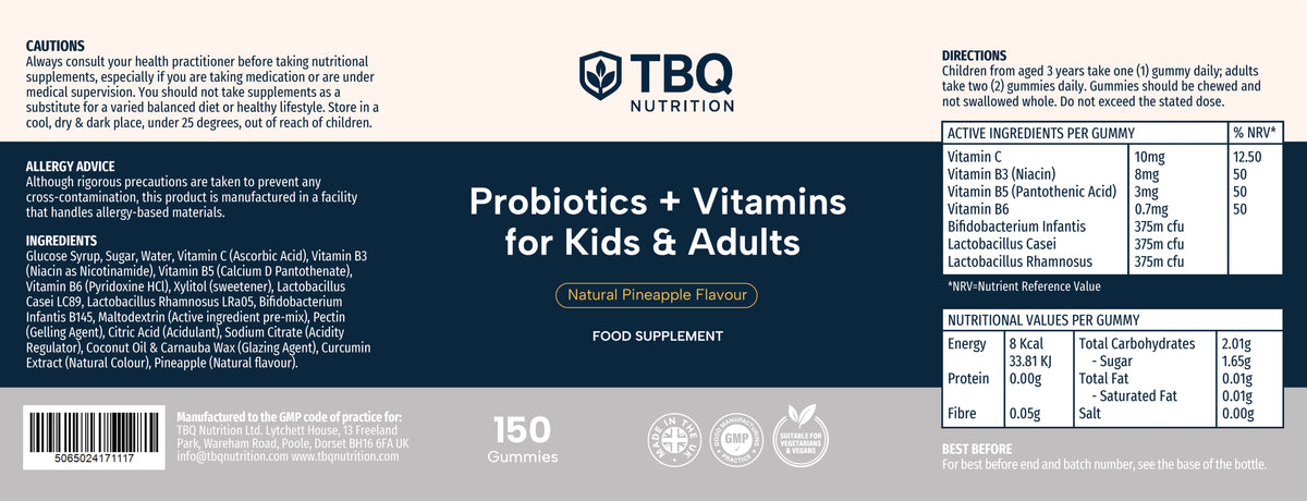 Each gummy provides 10mg vitamin C, 8mg niacin (vitamin B3), 3mg pantothenic acid (vitamin B5), 0.7mg vitamin B6, and 375 million CFU each of bifidobacterium infantis, lactobacillus casei, and lactobacillus rhamnosus. 150 gummies per bottle. Natural pineapple flavour. Food supplement suitable for vegetarians and vegans.