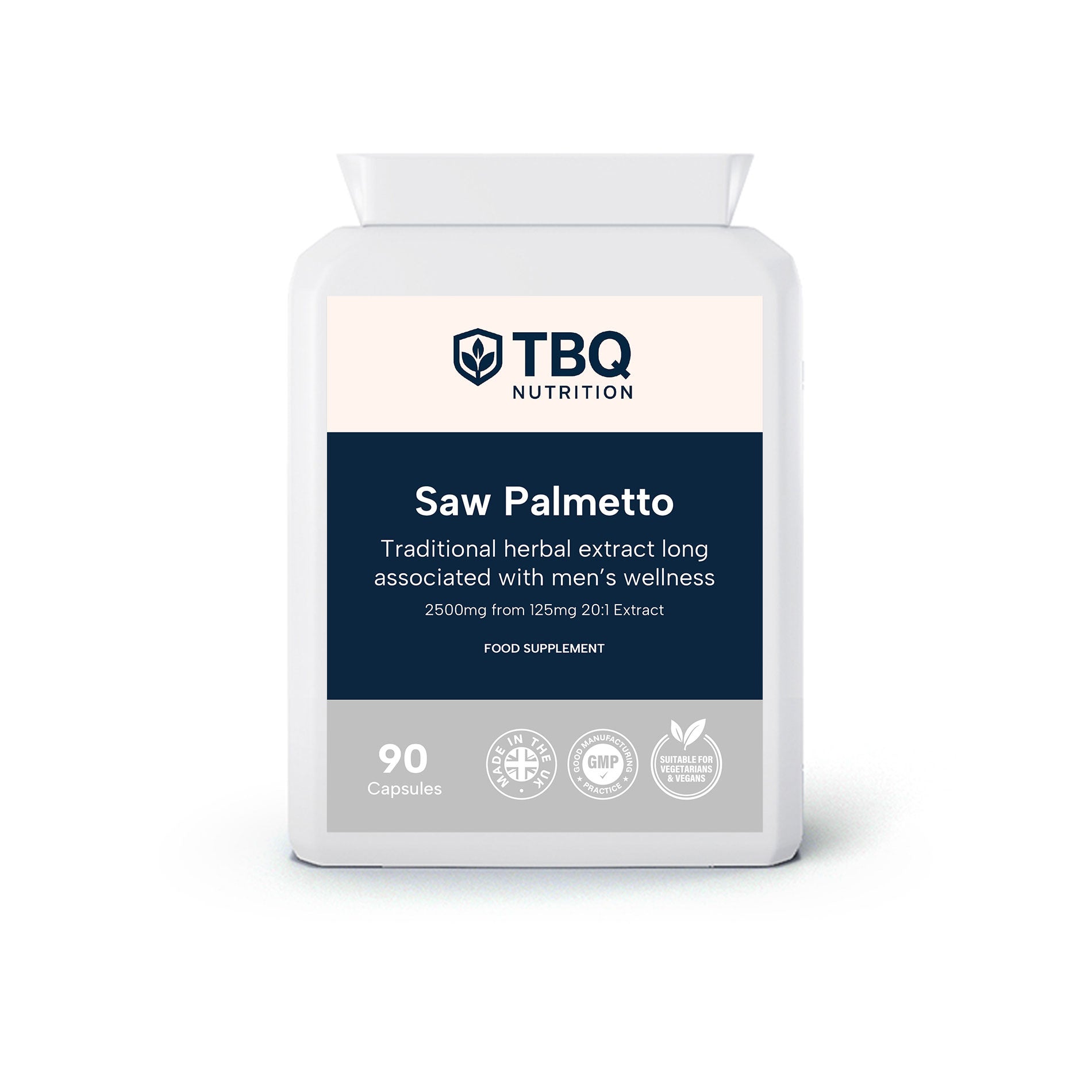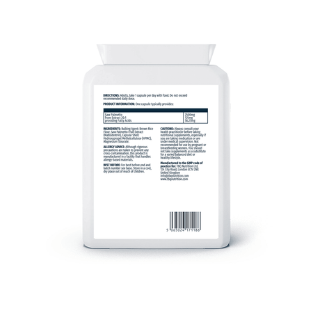TBQ Nutrition Saw Palmetto provides a concentrated 20:1 fruit extract, delivering the equivalent of 2500mg Saw Palmetto (Serenoa repens) per capsule. This traditional herbal extract has been long associated with men’s wellness and is widely used in nutritional support formulations. Each capsule is developed to offer a convenient daily serving in line with an active and balanced lifestyle. Suitable for vegetarians and vegans.
