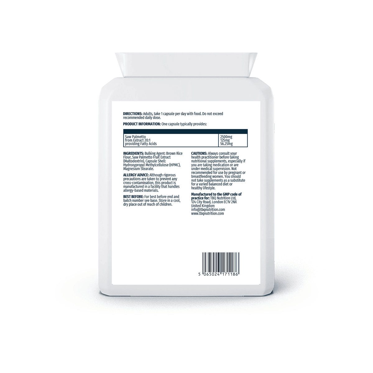 Each capsule provides 125mg Saw Palmetto Fruit Extract (20:1), equivalent to 2500mg Saw Palmetto, providing 56.25mg Fatty Acids. 90 capsules per bottle. Food supplement.