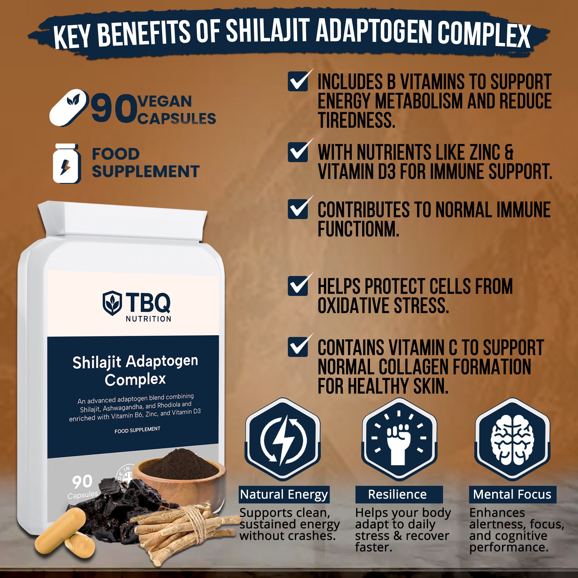Shilajit Adaptogen Complex combines premium extracts of shilajit, ashwagandha, and rhodiola, with black pepper for enhanced absorption, and is enriched with vitamin B6, zinc, and vitamin D3. Designed to support natural vitality, cognitive function, energy metabolism, and the immune system, this advanced formula is suitable for vegetarians and ideal for daily wellness and resilience.