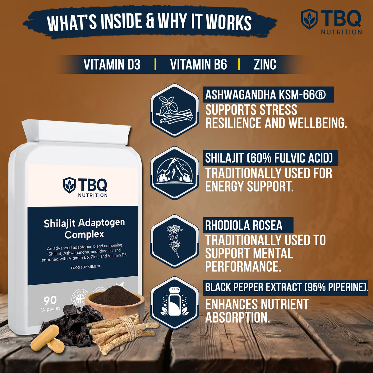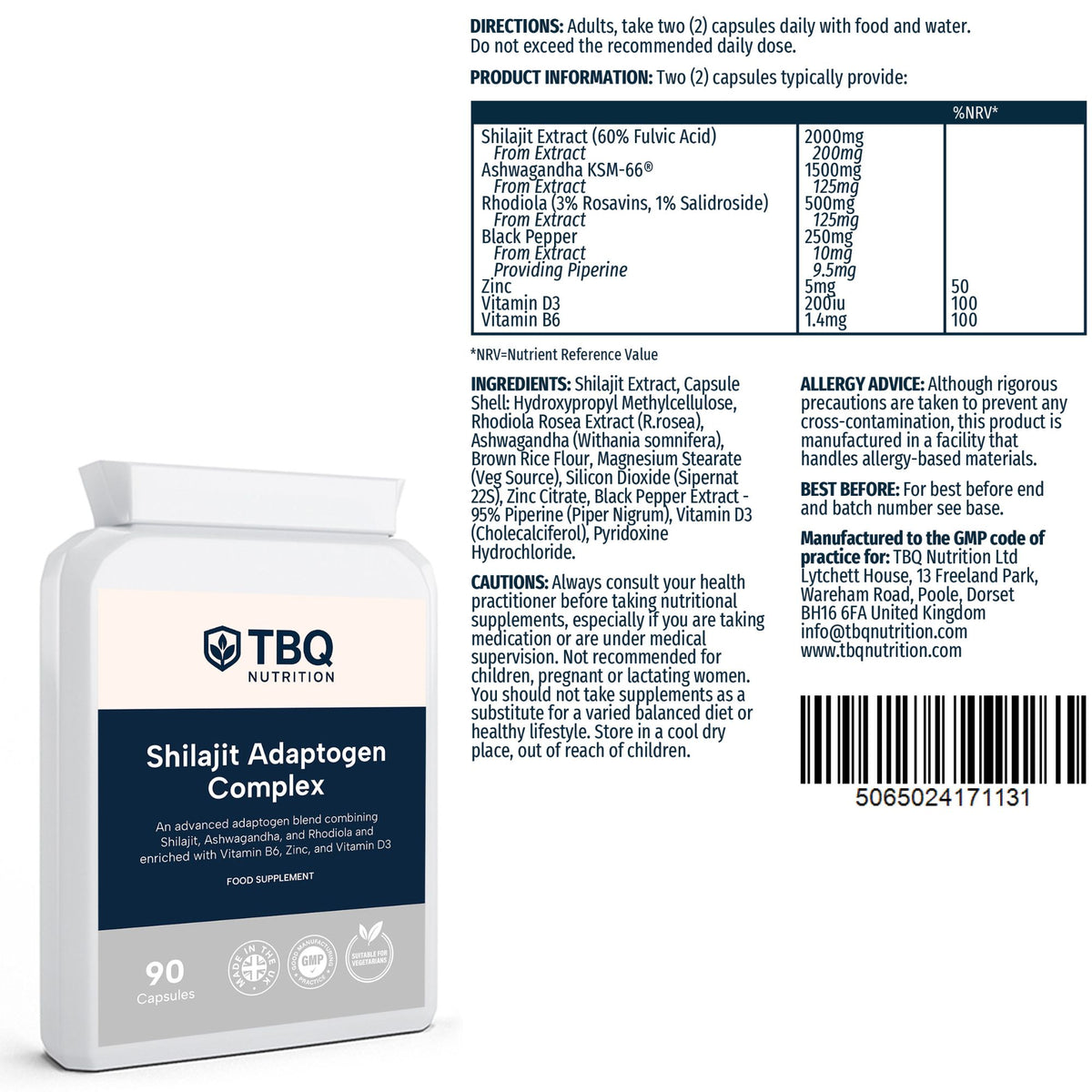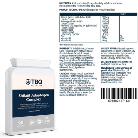 Each daily serving (2 capsules) provides 2000mg shilajit extract (60% fulvic acid), 1500mg ashwagandha extract, 500mg rhodiola extract (3% rosavins, 1% salidroside), 250mg black pepper extract (providing 9.5mg piperine), 5mg zinc, 200iu vitamin D3, and 1.4mg vitamin B6. 90 capsules per bottle. Food supplement suitable for vegetarians.