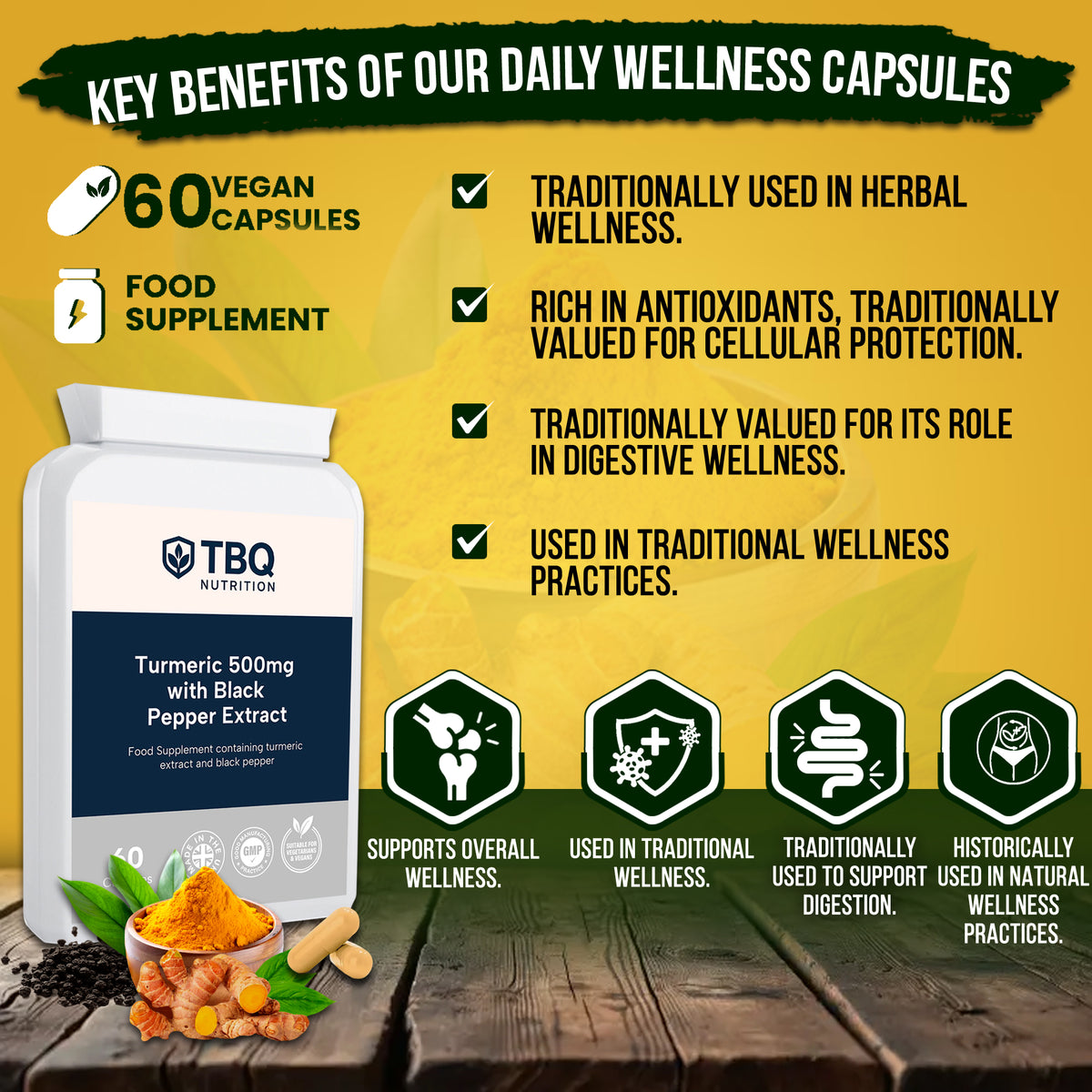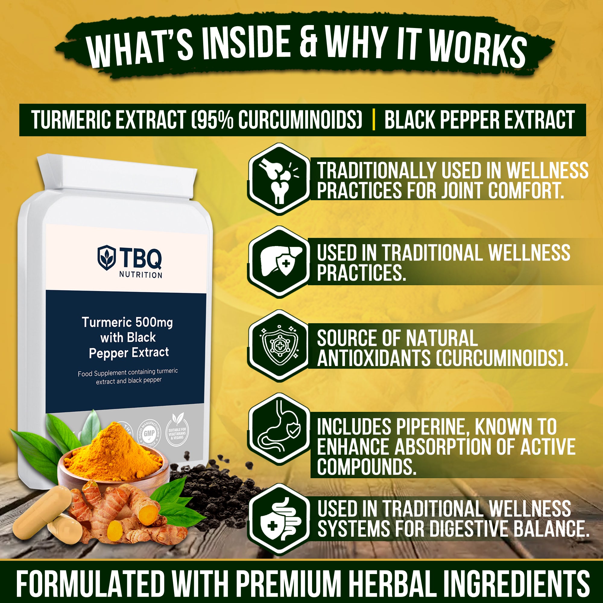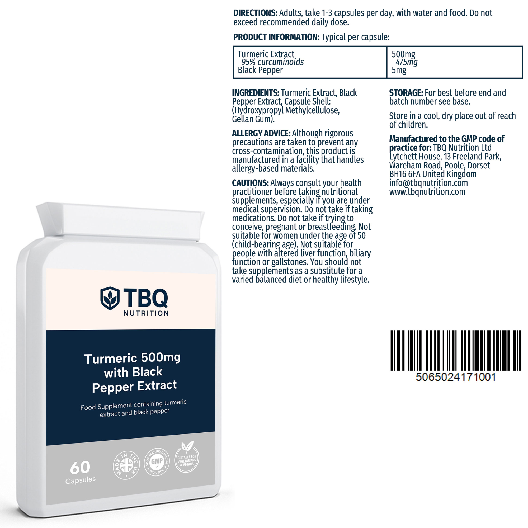 Each capsule contains 500mg turmeric extract (475mg curcuminoids) and 5mg black pepper extract. 60 capsules per bottle. Food supplement suitable for vegetarians and vegans.