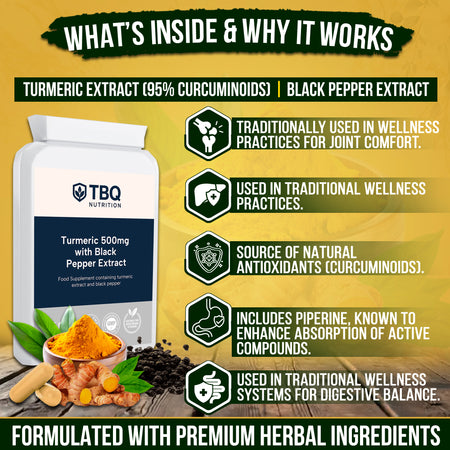 This advanced formula combines 500mg of turmeric extract (standardized to 95% curcuminoids) with 5mg of black pepper extract in every capsule. Turmeric is well known for its antioxidant properties and its traditional use in supporting joint comfort and immune function. Black pepper extract is included to enhance absorption and maximize the benefits of turmeric. This supplement is ideal for anyone seeking daily support for joint health, immune system, and overall wellbeing.