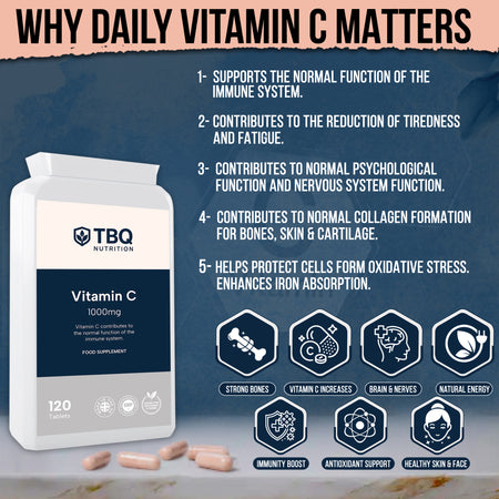 Vitamin C is a vital nutrient for daily health, providing powerful antioxidant support and helping to maintain a strong immune system. Each capsule contains 1000mg of pure Vitamin C to protect your cells from oxidative stress, promote natural collagen production for healthy skin, bones, and joints, and support energy levels throughout the day. Ideal for anyone seeking everyday wellness and effective immune defence.