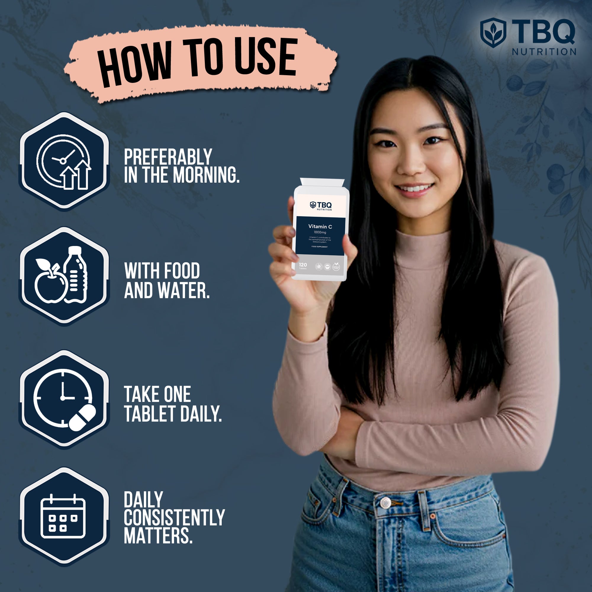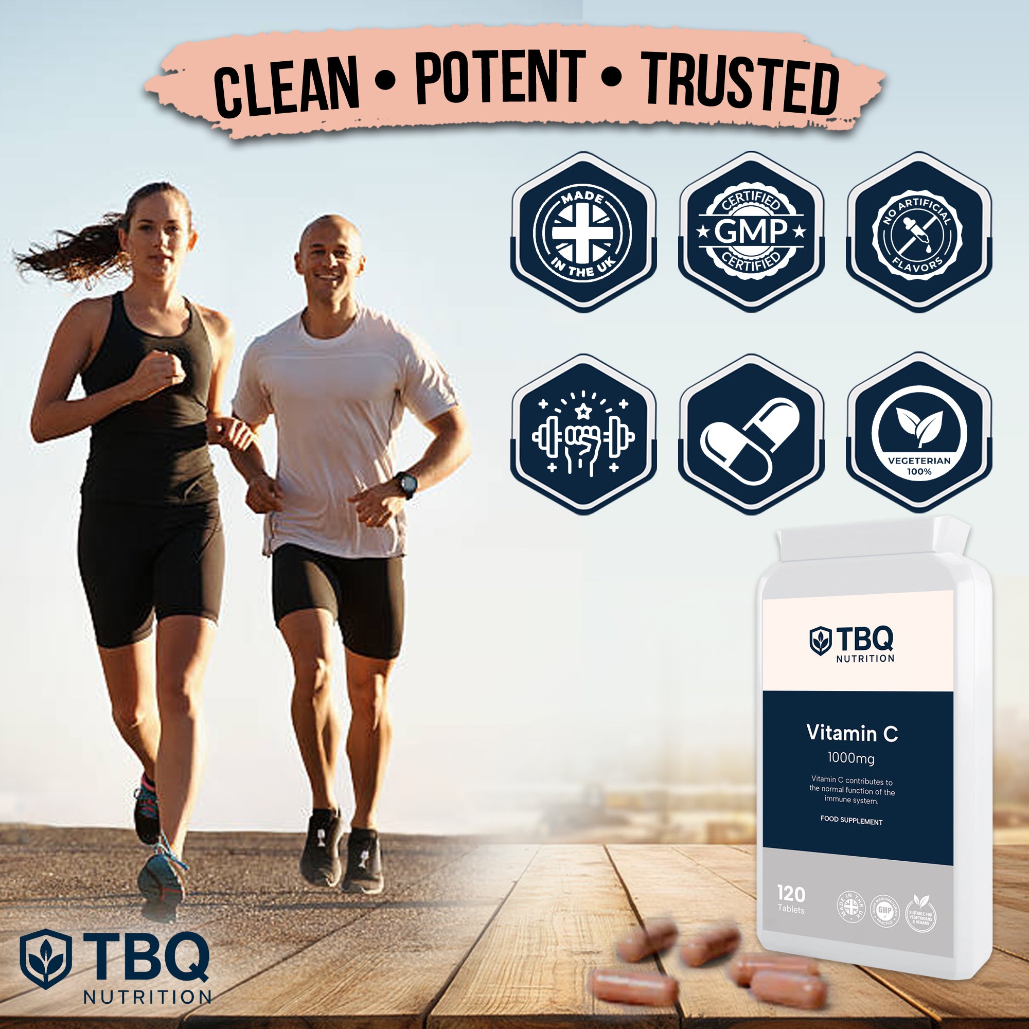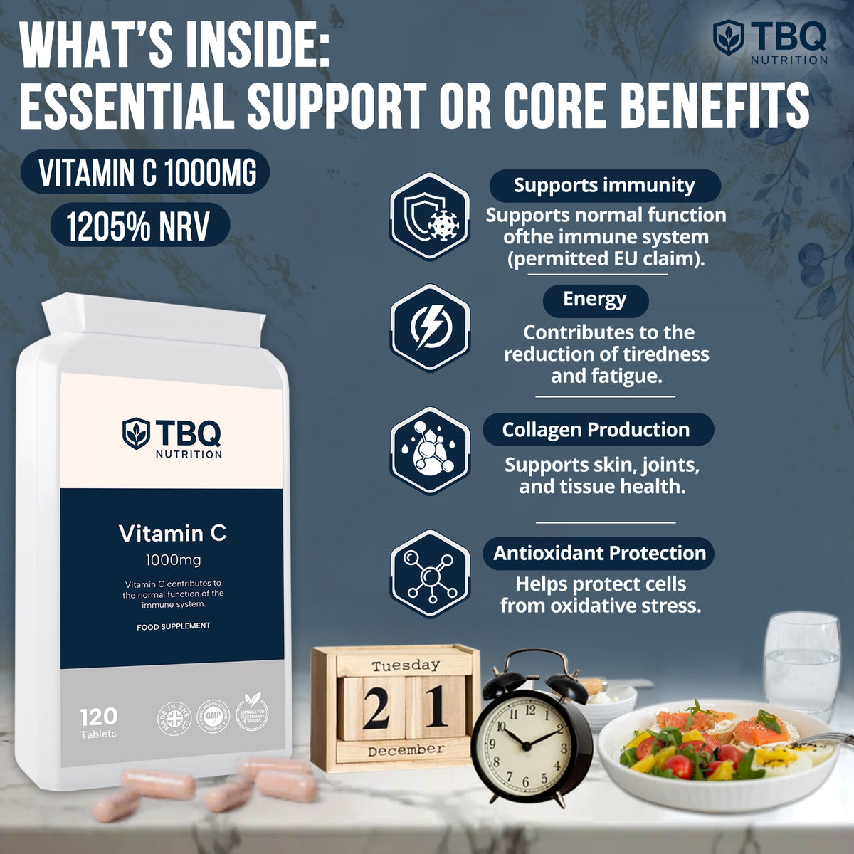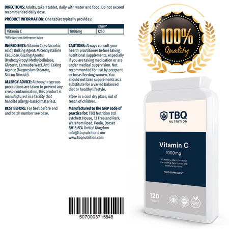 1000mg Vitamin C (as Ascorbic Acid) per capsule. 120 capsules per bottle. Food supplement suitable for vegetarians and vegans.