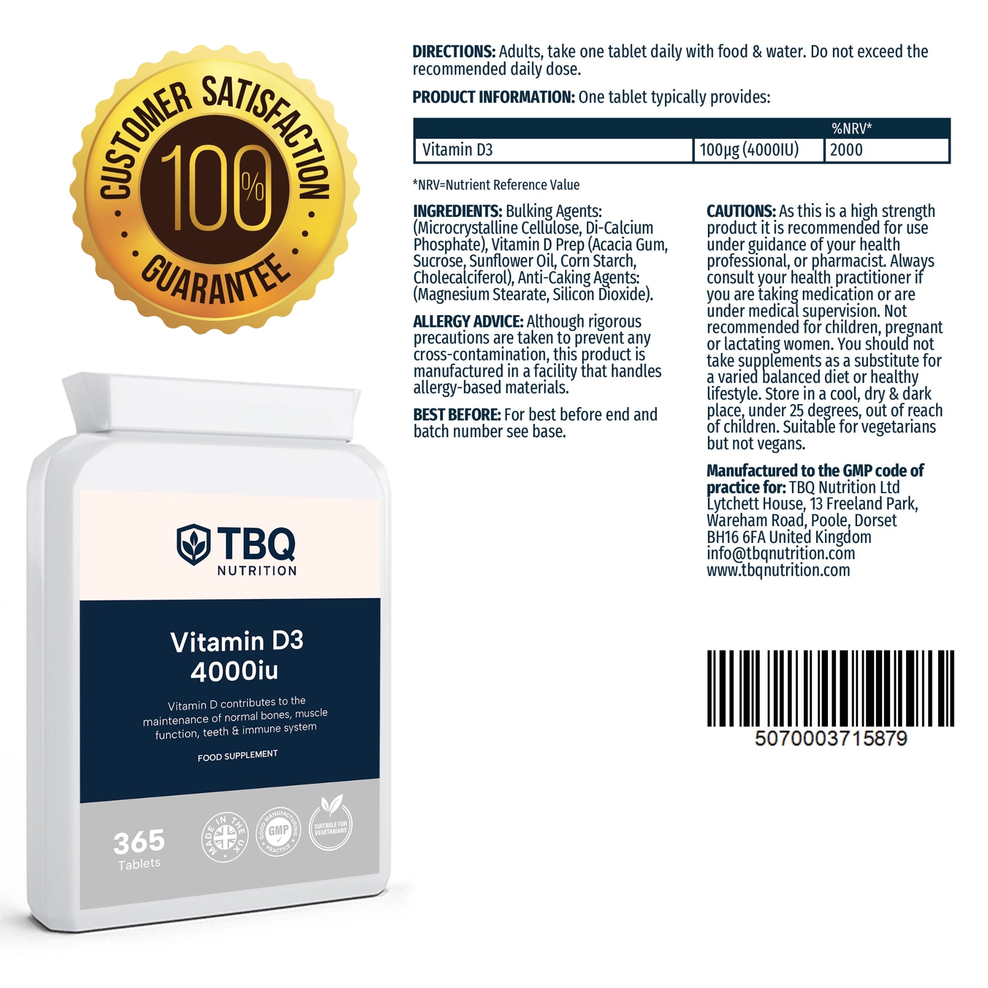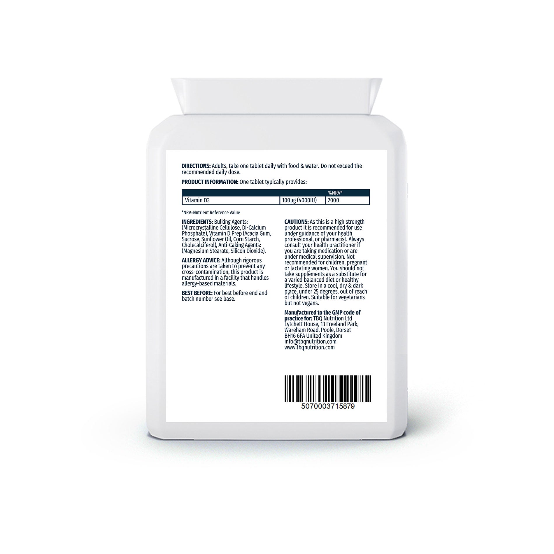 Each tablet provides 100μg (4000iu) of Vitamin D3. 365 tablets per bottle. Food supplement suitable for vegetarians.